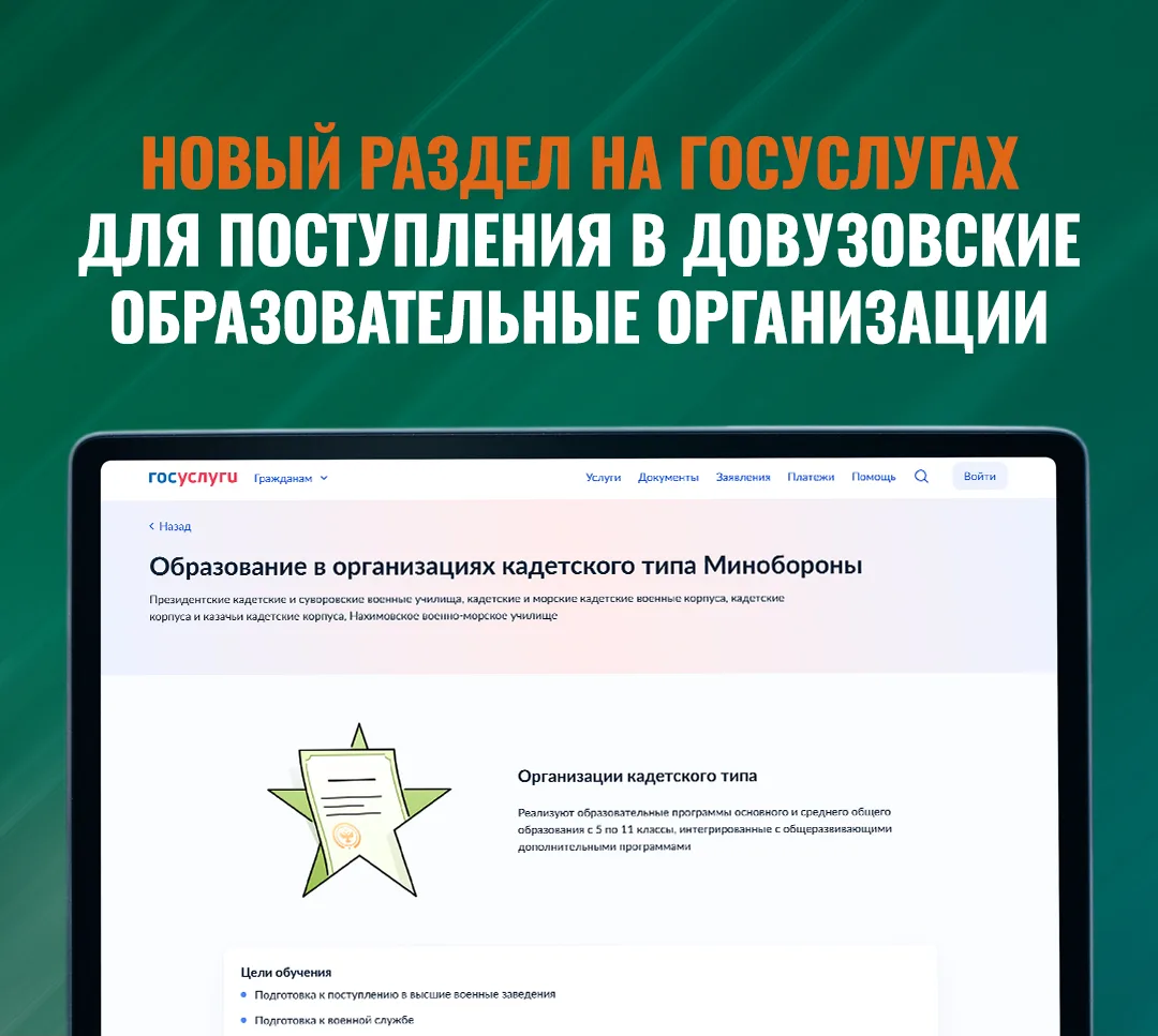 В преддверии приемной кампании 2026 года на Едином портале государственных услуг запущен новый раздел, посвященный поступлению граждан в президентские и суворовские училища, морские и казачьи кадетские военные корпуса, Нахимовские военно-морские училища и пансионы воспитанниц Минобороны.