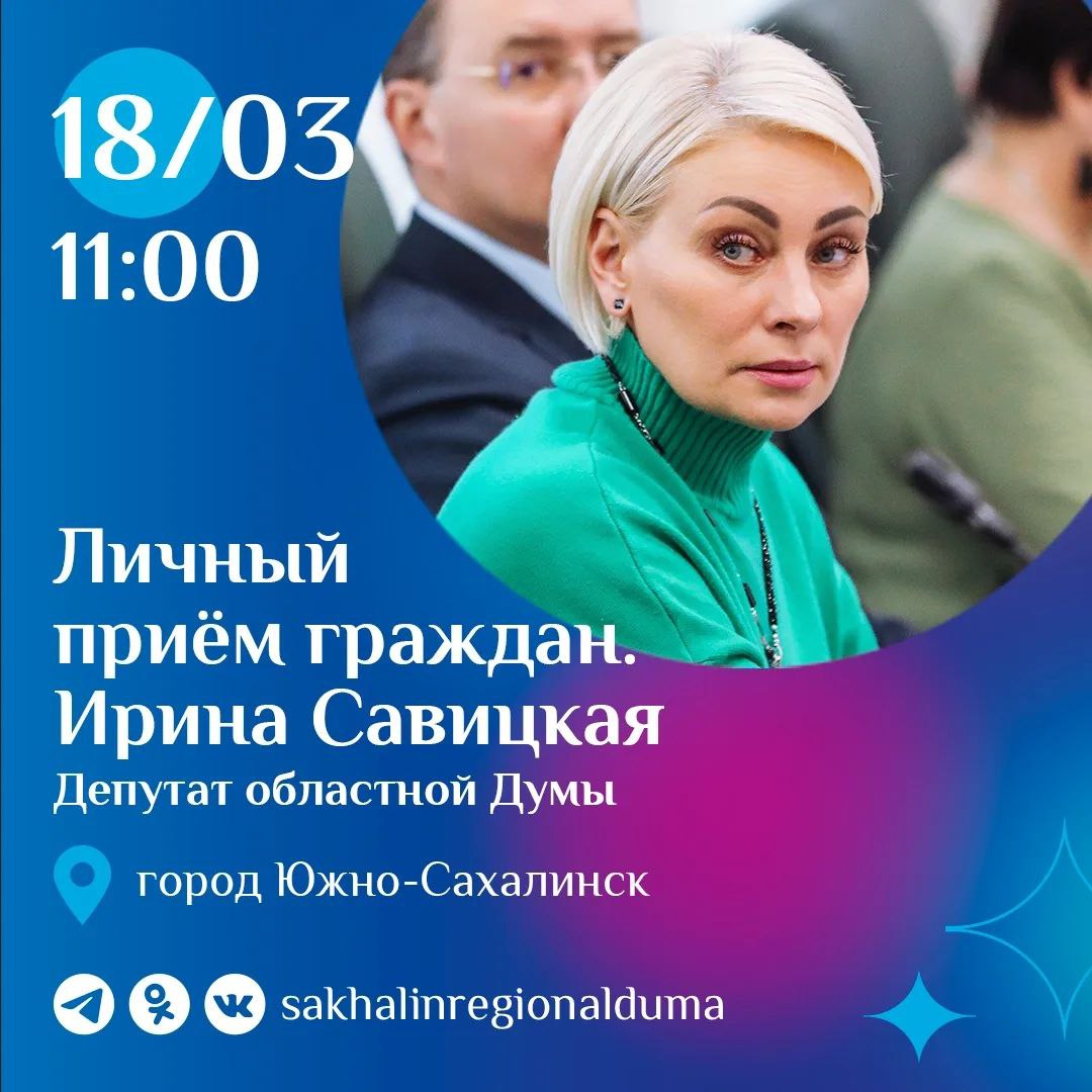 Завтра, 18 марта, с 11:00 депутат Сахалинской областной Думы Ирина Савицкая проведет личный прием граждан