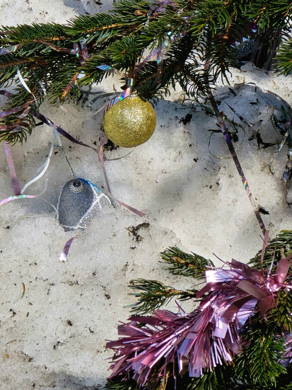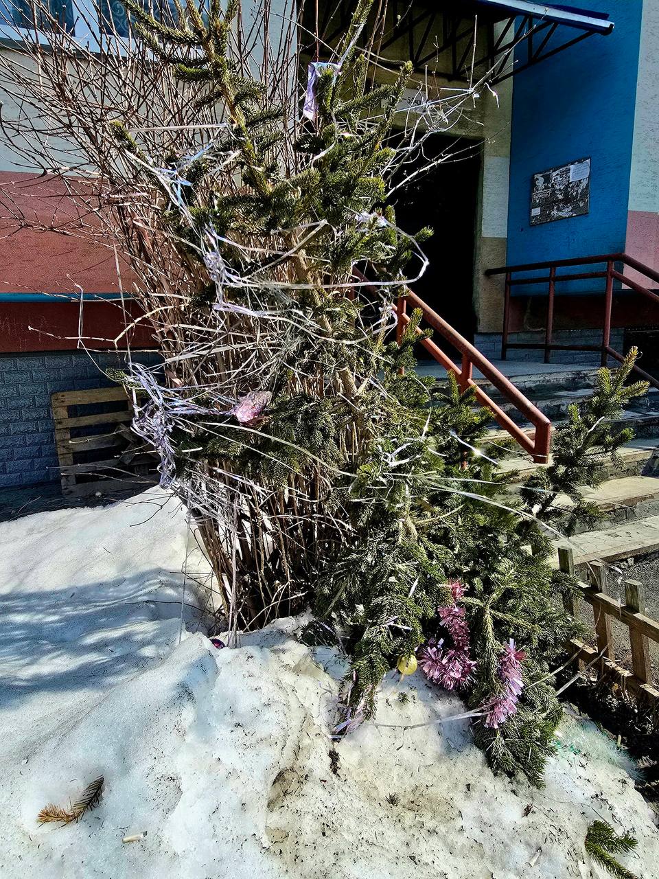 В кадр попали не только распускающиеся цветы, но и, к удивлению, оставшаяся после Нового года елка.