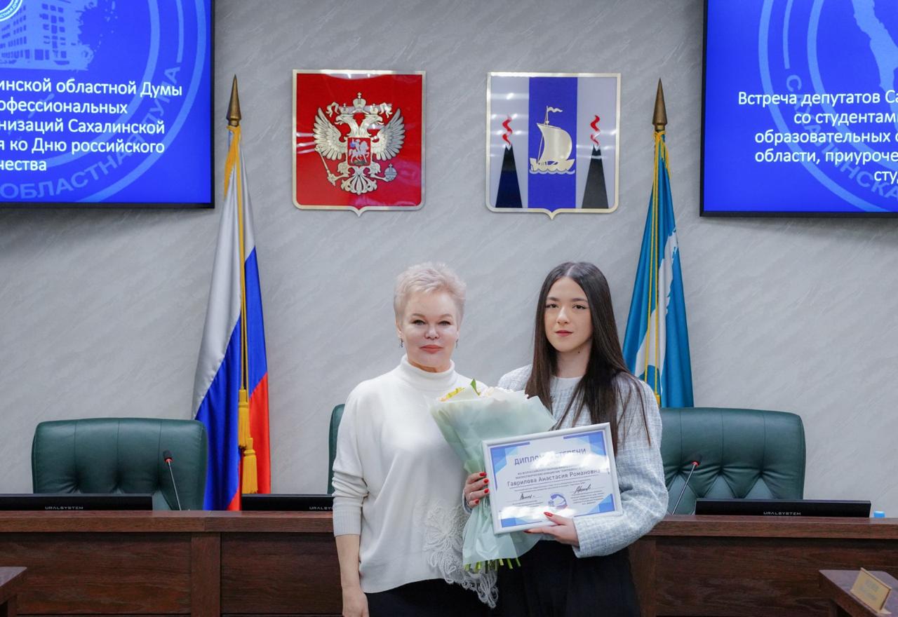 Год назад, в торжественной обстановке я наградила представителей Сахалинской области, ставших финалистами конкурса. Дипломы III степени получили ученица 11-го класса школы № 3 города Невельска Анастасия Гаврилова, а также ее научный руководитель Светлана Валерьевна Курганская.