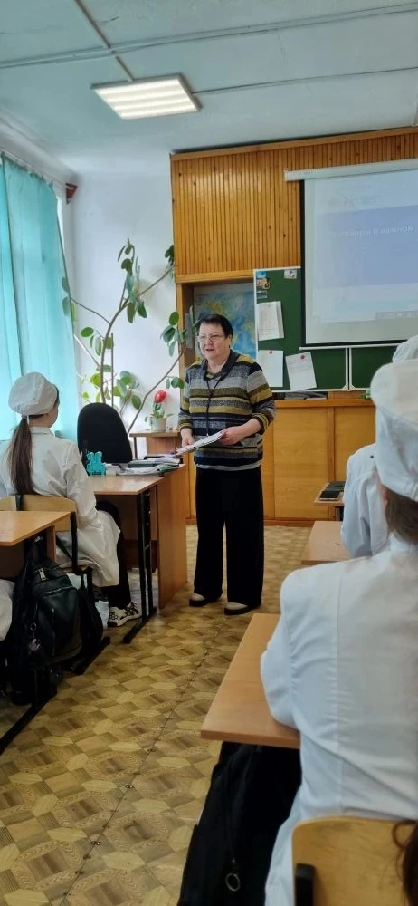 Учащимся Сахалинского политехнического центра, филиала ГБПОУ «Сахалинский базовый медицинский колледж» Надежда Васильева рассказала об истории, сроках полномочий, подписанных законах двенадцати Государственных Дум, о предстоящих выборах депутатов Госдумы девятого созыва.