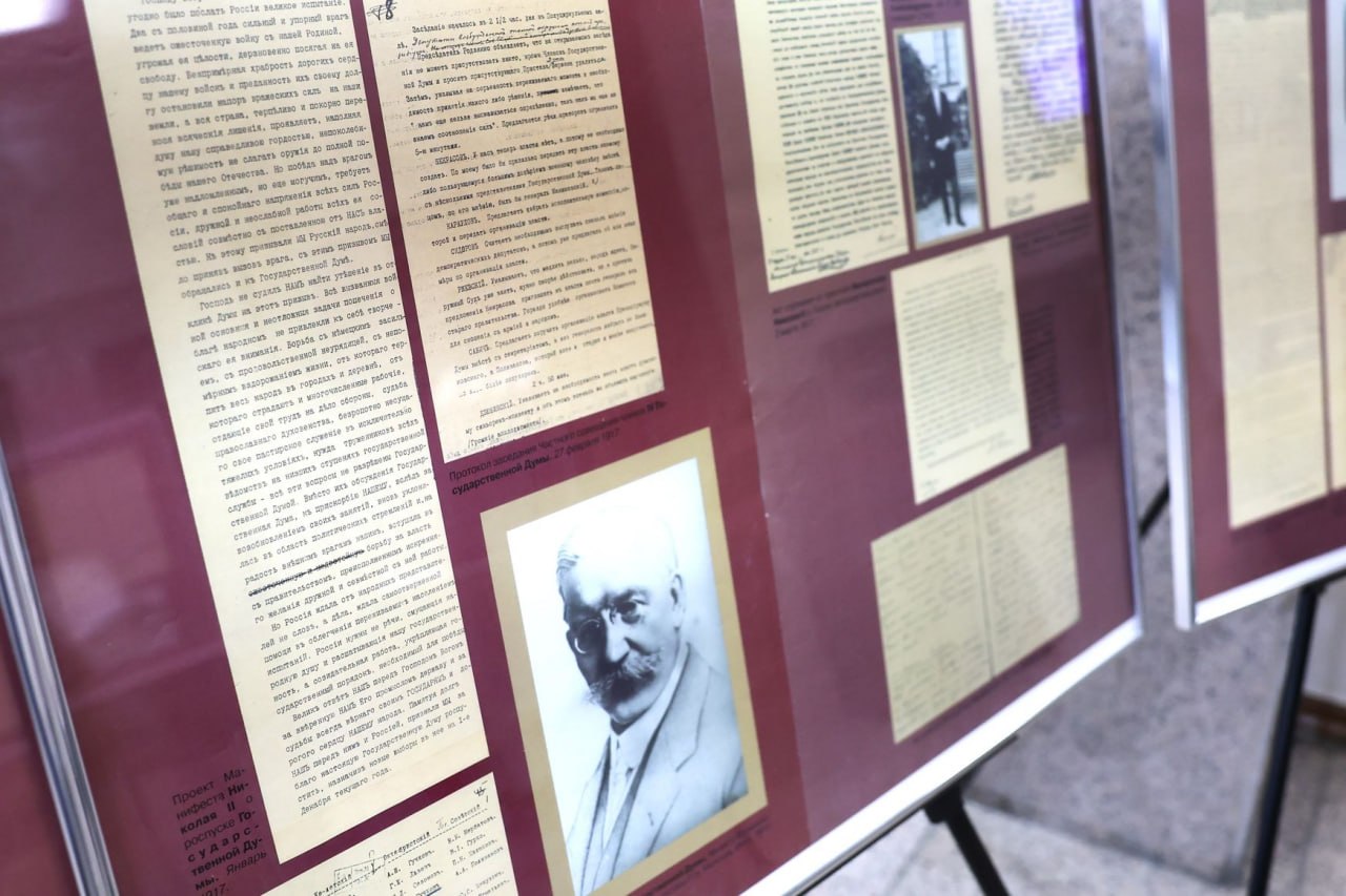 На стендах расположены уникальные копии архивных документов, фотографии и материалы, отражающие эволюцию демократических институтов и преемственность парламентских традиций в нашей стране.
