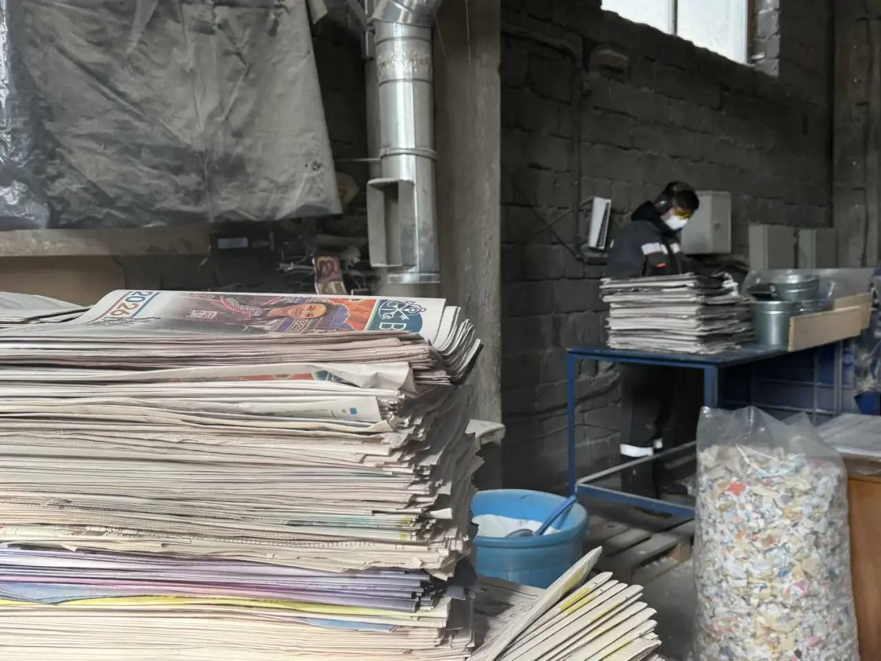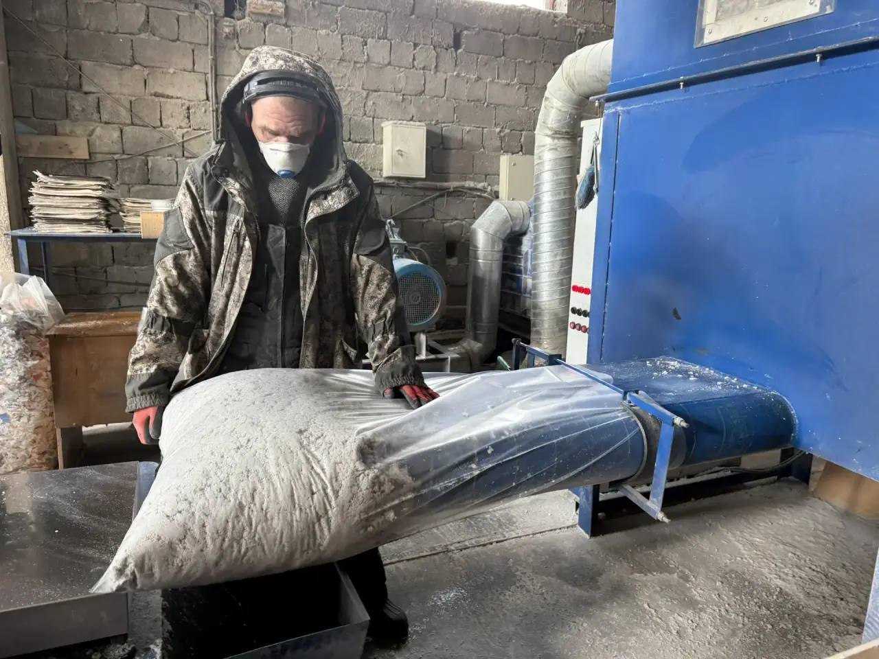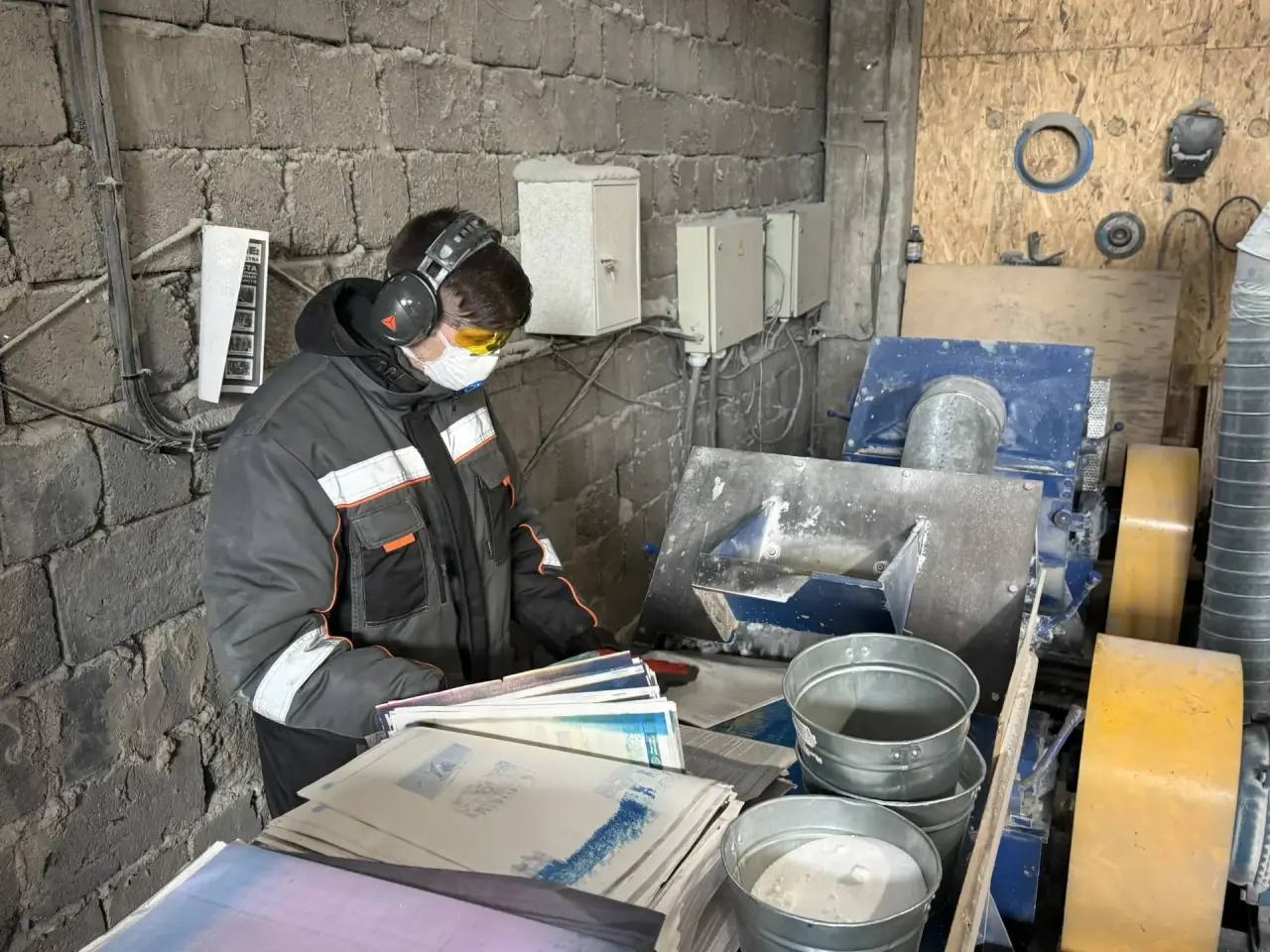 Большую партию вторсырья, свыше 800 килограммов, на предприятие передали только вчера, а сегодня ее уже активно перерабатывают. Чтобы сделать один мешок утеплителя, нужно 13 килограммов макулатуры и пару секунд времени. В смену удается выпустить около сотни таких.