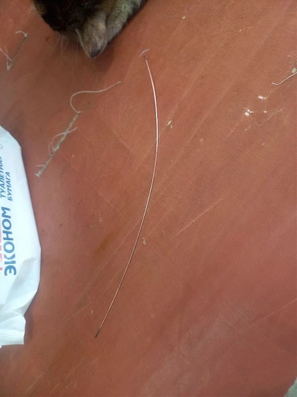 "Случай оказался сложным, было принято решение ввести кошку в медикаментозный сон. При осмотре полости рта в глубине глотки блеснул металлический предмет, и ветеринарный врач Татьяна Александровна осторожно извлекла его — в руках оказалась проволока длиной 22 см. Жизненно важные органы задеты не были. Молодое животное после проведенной манипуляции чувствует себя хорошо", – отметили в ведомстве.