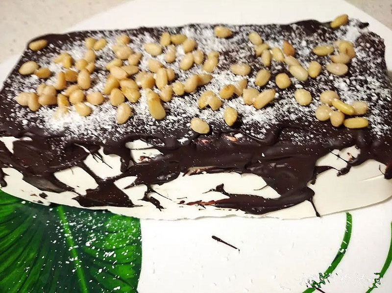 Перед подачей растопите шоколад на водяной бане или в микроволновке, периодически помешивая, пока он не станет жидким. Аккуратно выньте замороженный торт из формы и полейте его растопленным шоколадом, который быстро застынет. Украсить торт кокосовой стружкой и кедровыми орехами. Подавайте сразу или верните в морозильник до момента подачи.
