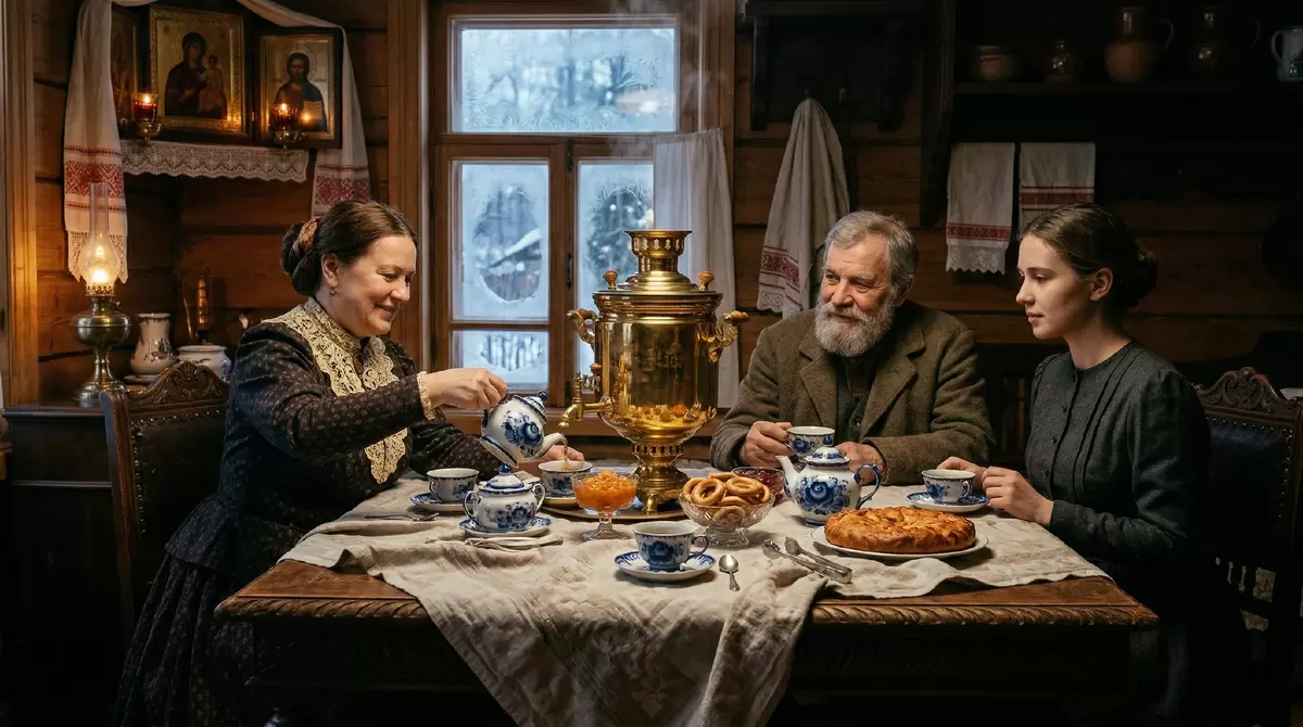 Чаепитие в России стало не просто способом утоления жажды, а настоящим искусством общения. Чай наливали много раз, беседы длились часами, а на столе неотъемлемо присутствовали угощения: баранки, пироги и варенье. Таким образом, процесс превращался в почти театральное представление.