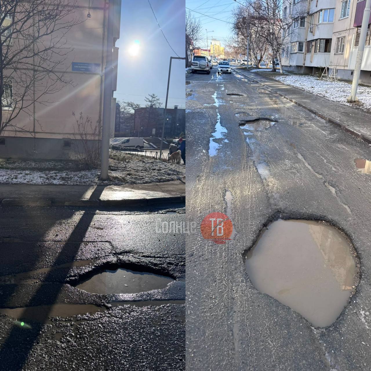 Кадры с коварного участка в 9 микрорайоне Южно-Сахалинска прислала наша подписчица. Там сегодня утром пробили шины, как минимум, два автомобиля.