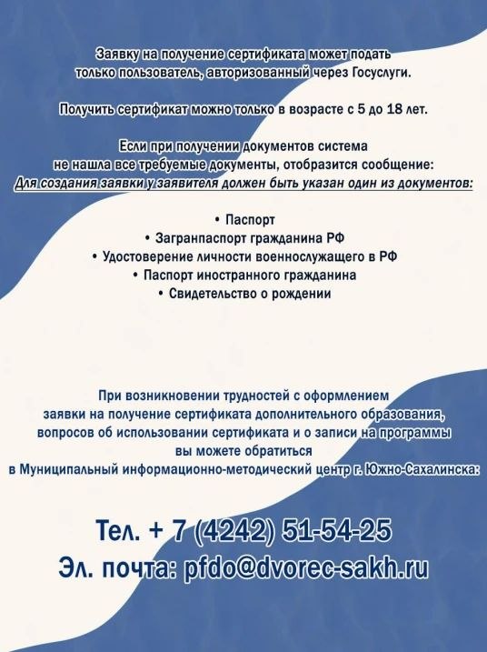 Специалисты департамента образования Южно-Сахалинска напомнили родителям, зачем нужен сертификат допобразования и как его получить. Документ можно оформить на детей от 5 до 17 лет.