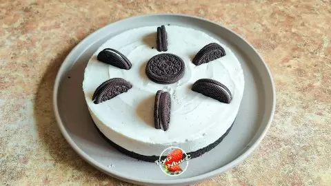 Готовая начинка разравнивается на охлаждённой основе, сверху украшается половинками печенья и отправляется в холодильник на несколько часов — лучше на ночь. Результат — спокойный, лаконичный десерт с характерным вкусом Орео и нежной текстурой.