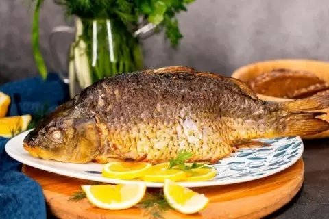 Готовый карп обильно украсить половинкой лимона и свежей зеленью перед подачей на стол. Это блюдо станет великолепным украшением любого стола и поразит гостей своим изысканным вкусом!