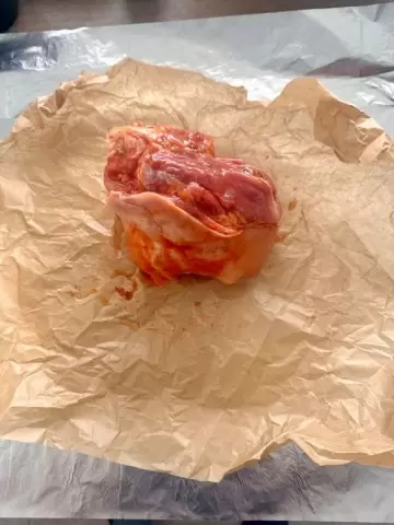 - Подготовка к запеканию. На третий день в 12:00 разложите рульку на листе пергамента, предварительно обернув в несколько слоев фольги.