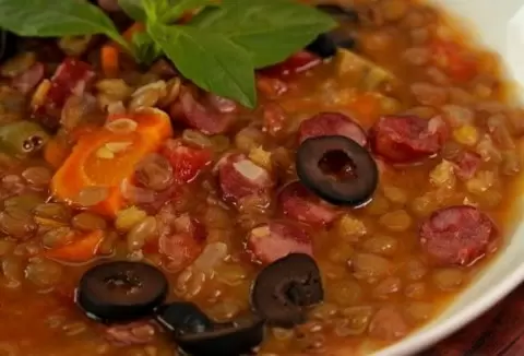 Лук обжаривается на оливковом масле до золотистой корочки, затем добавляются морковь и чеснок, после чего кладутся колбаски. Обжаривать их следует около 5-7 минут до готовности. Затем добавленные ингредиенты перемещают в кастрюлю с чечевицей, куда также отправляются нарезанные помидоры и лавровый лист, а потом — соль и перец. В конце вливается лимонный сок, добавляются нарезанные кружочками маслины и оливки, после чего суп варится всего одну минуту.