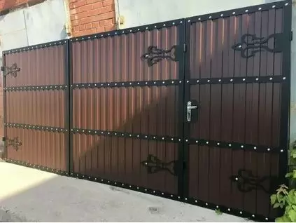 При креплении профнастила стоит использовать саморезы с уплотнительными шайбами, чтобы обеспечить надежную фиксацию. Оконце может быть оформлено кованым элементом или прозрачным поликарбонатом, что добавит индивидуальности.