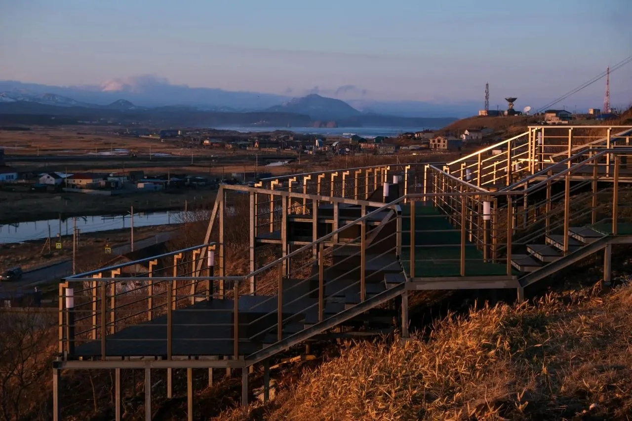 Это уникальный проект пешеходной лестницы, соединяющий верхнюю часть поселка с берегом Южно-Курильской бухты. Скоро здесь появятся обзорные площадки, зоны отдыха и амфитеатр со сценой.