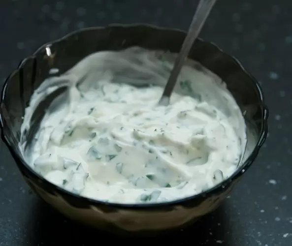 - Приготовление: Измельчите чеснок, порубите укроп и смешайте все ингредиенты в миске. Дайте соусу настояться в холодильнике около 40 минут для достижения наилучшего вкуса.