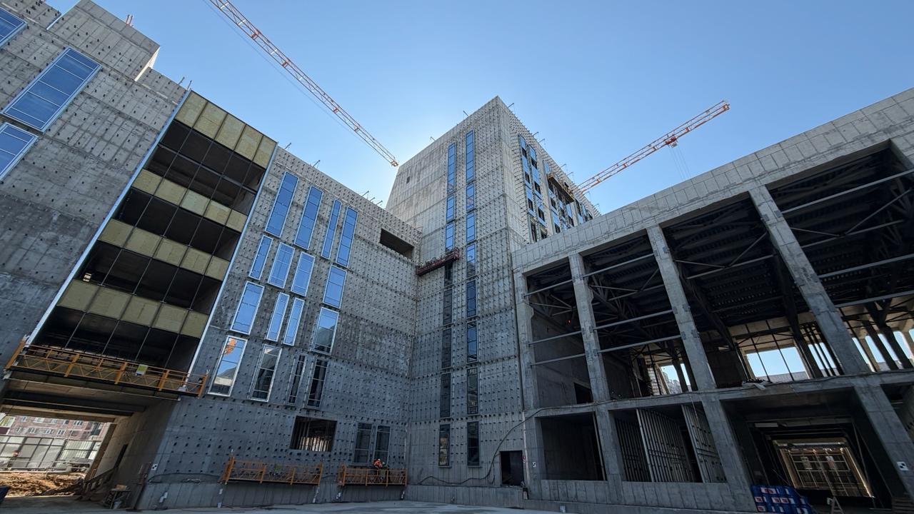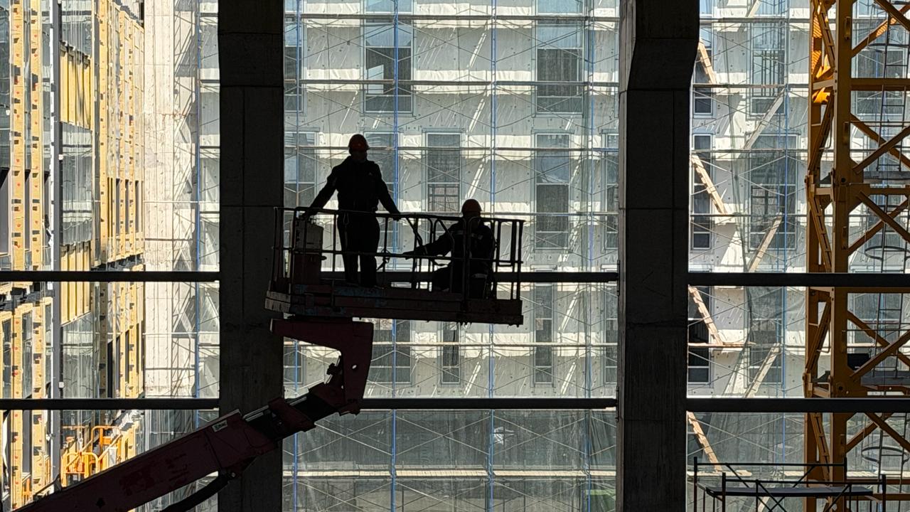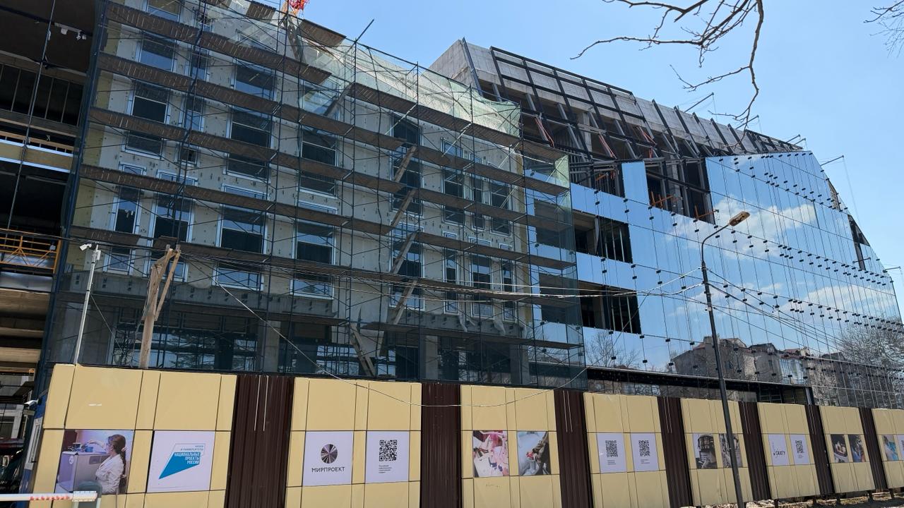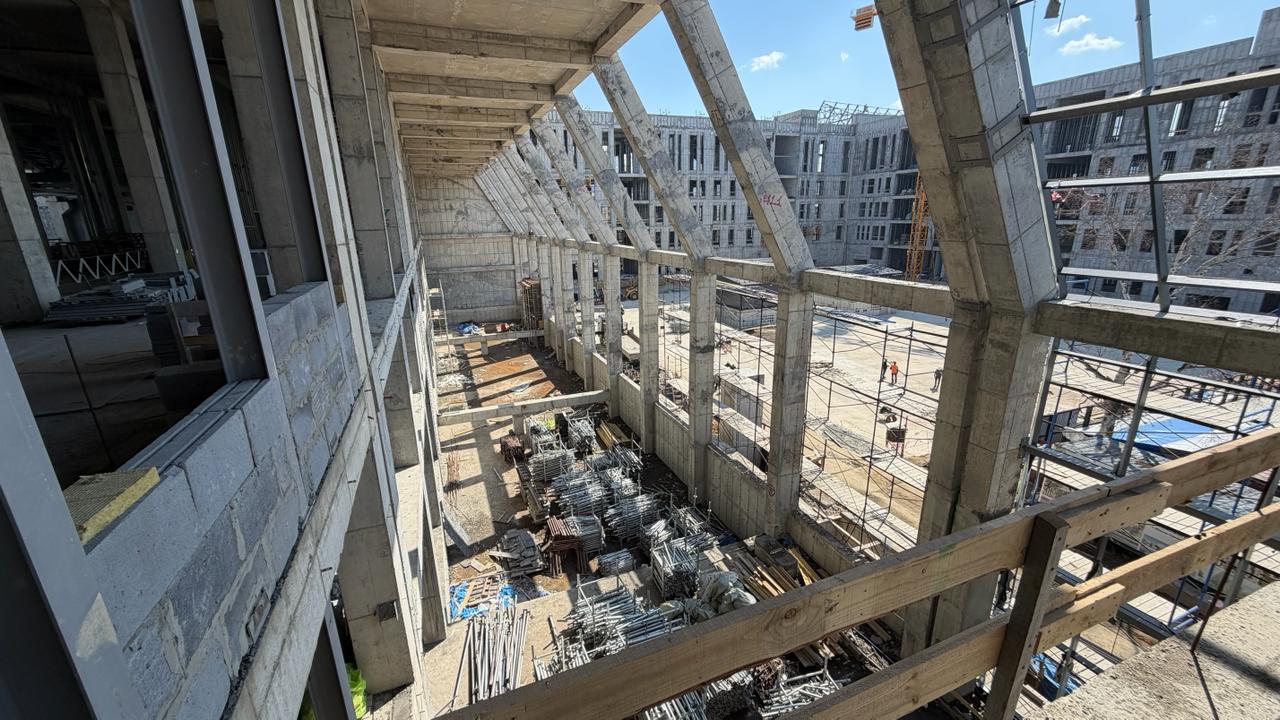 На площадке в две смены работают 410 человек. Приоритет — закрытие наружного контура: монтаж светопрозрачных конструкций, утепление и облицовка фасадов. Параллельно ведутся внутренние работы: монтаж перегородок из гипсоволокнистого листа и газоблоков, прокладка инженерных сетей. Задача подрядчика — создать тёплый контур до начала отопительного сезона, чтобы затем приступить к отделке.