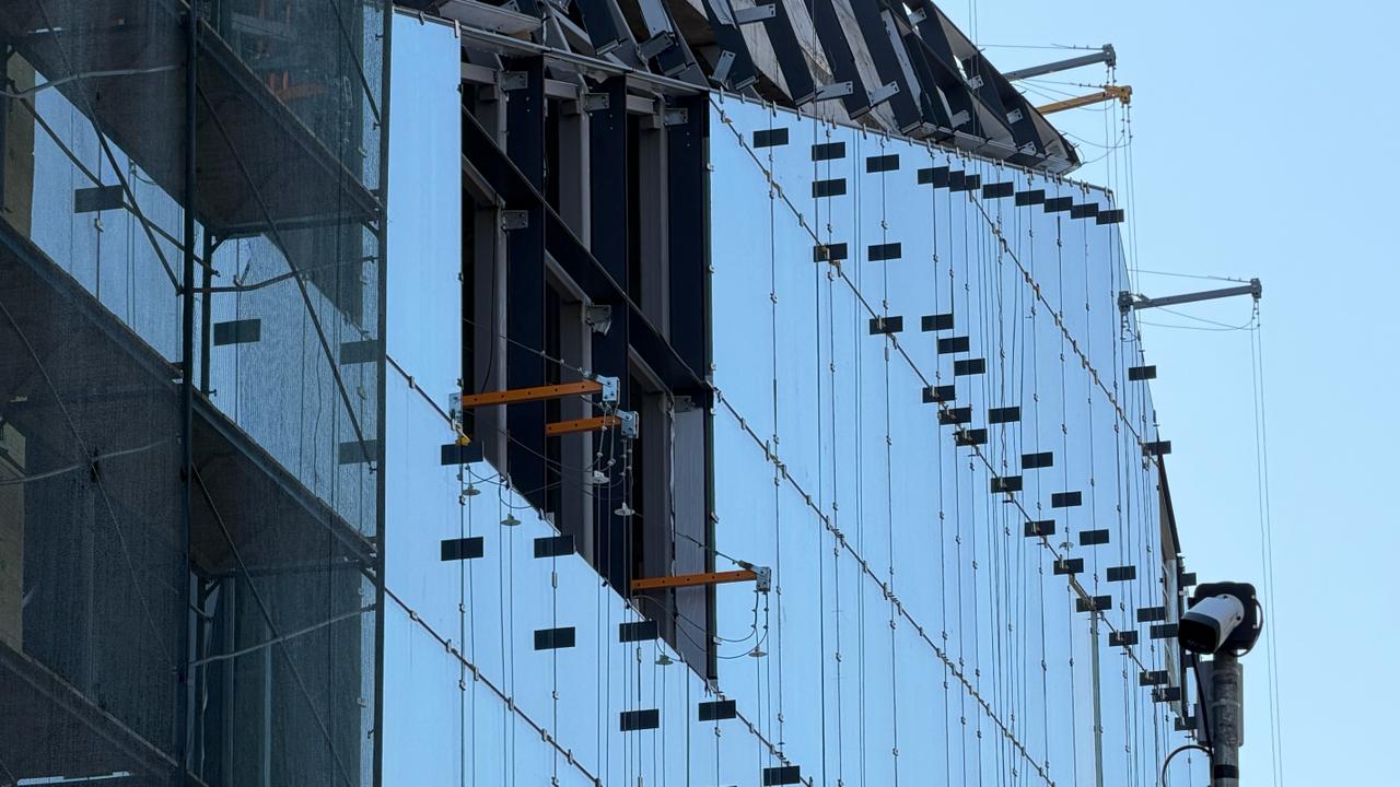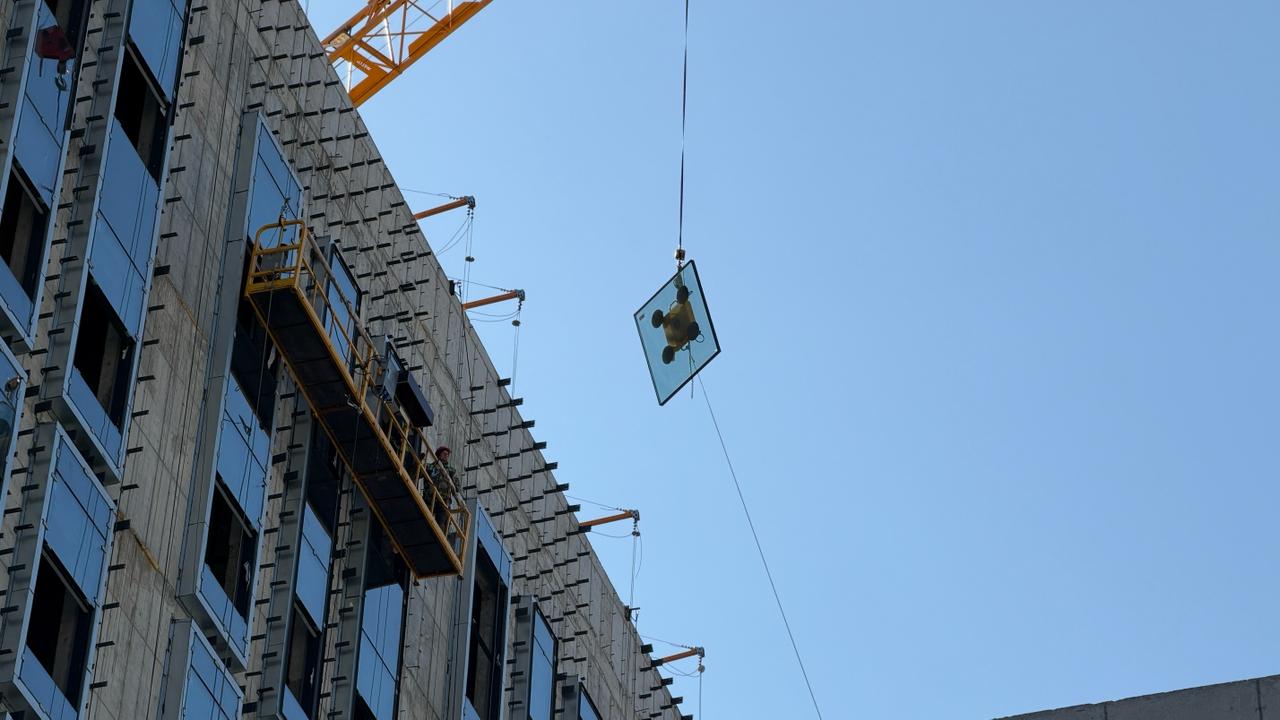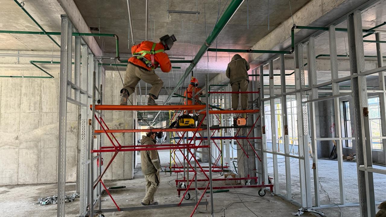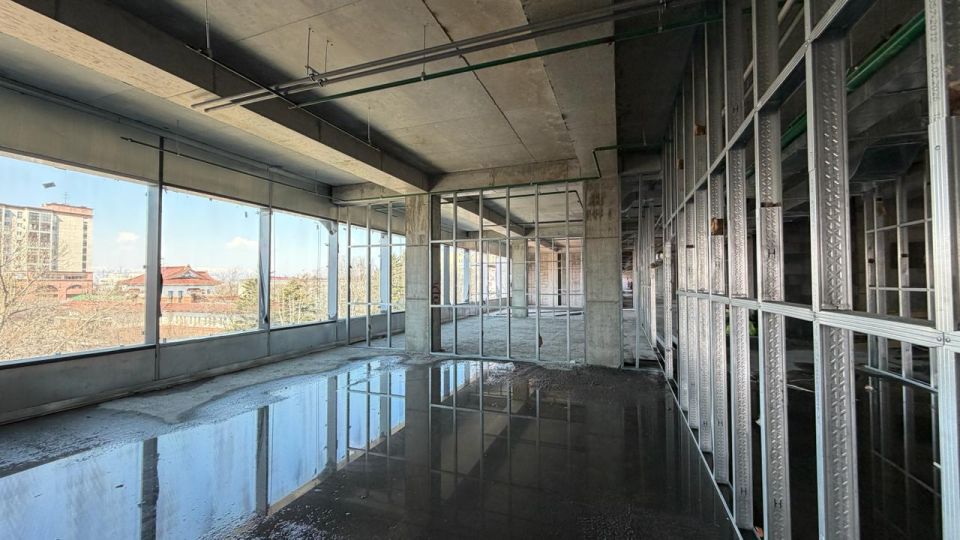 На площадке в две смены работают 410 человек. Приоритет — закрытие наружного контура: монтаж светопрозрачных конструкций, утепление и облицовка фасадов. Параллельно ведутся внутренние работы: монтаж перегородок из гипсоволокнистого листа и газоблоков, прокладка инженерных сетей. Задача подрядчика — создать тёплый контур до начала отопительного сезона, чтобы затем приступить к отделке.