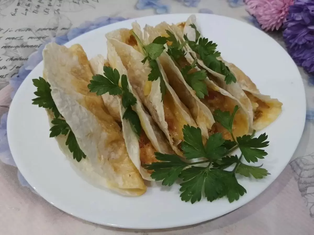На сковороду с растительным маслом добавляется лук, который обжаривается до золотистой корочки, после чего в сковороду добавляются нарезанные помидоры и перец. Все ингредиенты обжариваются несколько минут, а затем к овощам добавляется куриное мясо. Начинка приправляется солью, перцем и чесноком. После этого в начинку добавляется половина натертого сыра.