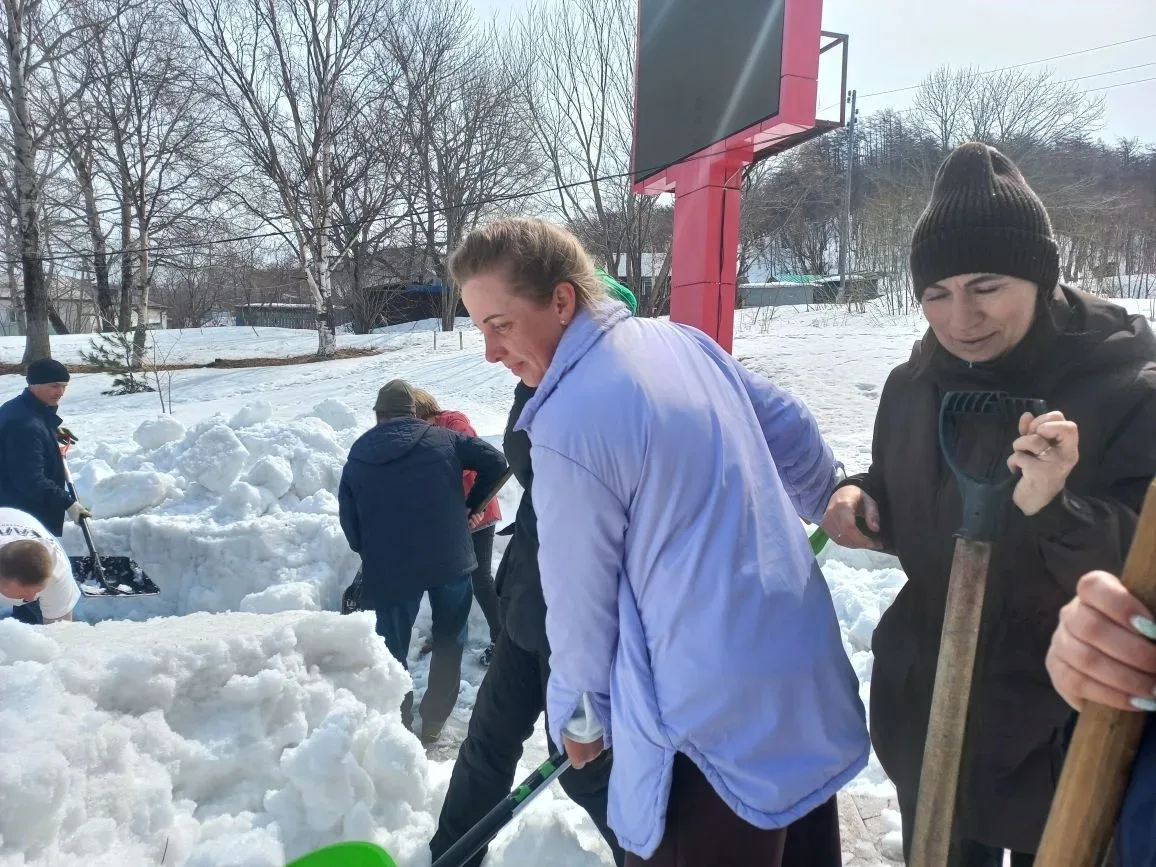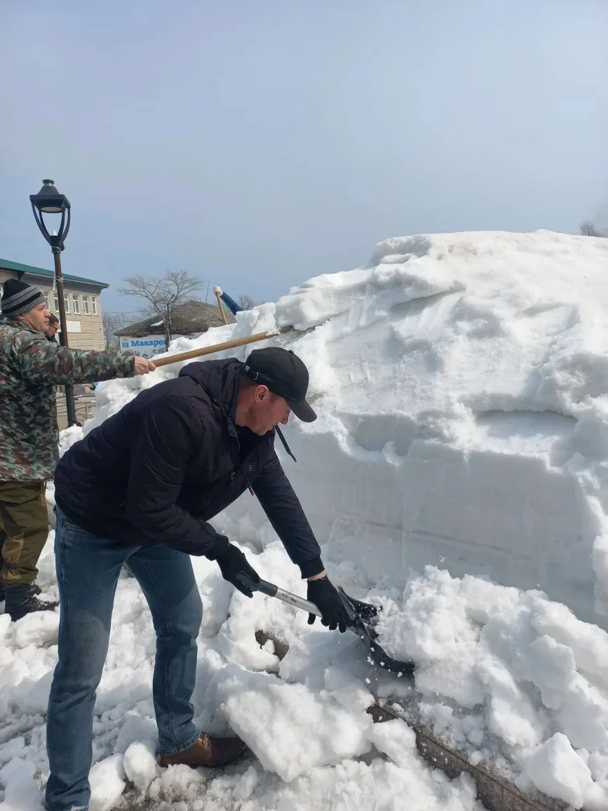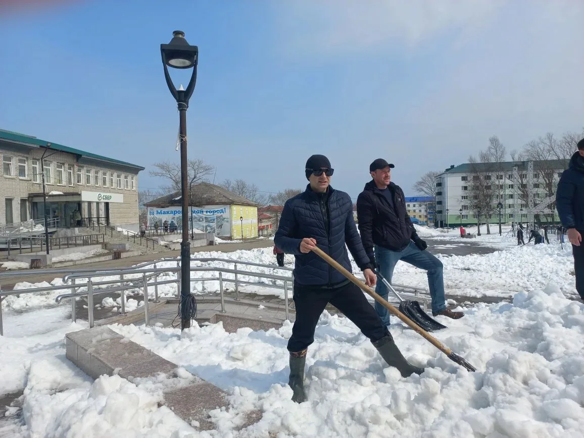 Совместными усилиями вышли на уборку снега на центральной площади города Макарова.