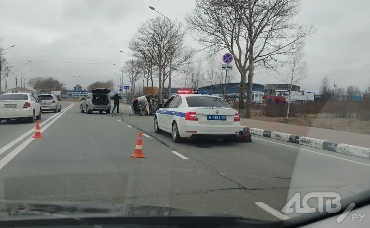Автомобиль перевернулся на бок во время аварии в Южно-Сахалинске