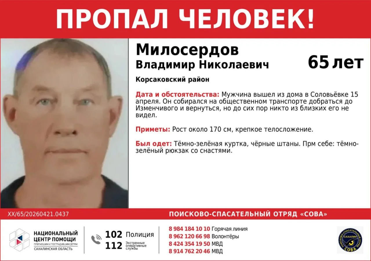 65-летний Владимир Николаевич Милосердов вышел из дома в Соловьёвке 15 апреля. Он собирался доехать до Изменчивого на автобусе и вернуться, но с тех пор близкие его не видели. Об этом сообщает ПСО «Сова».