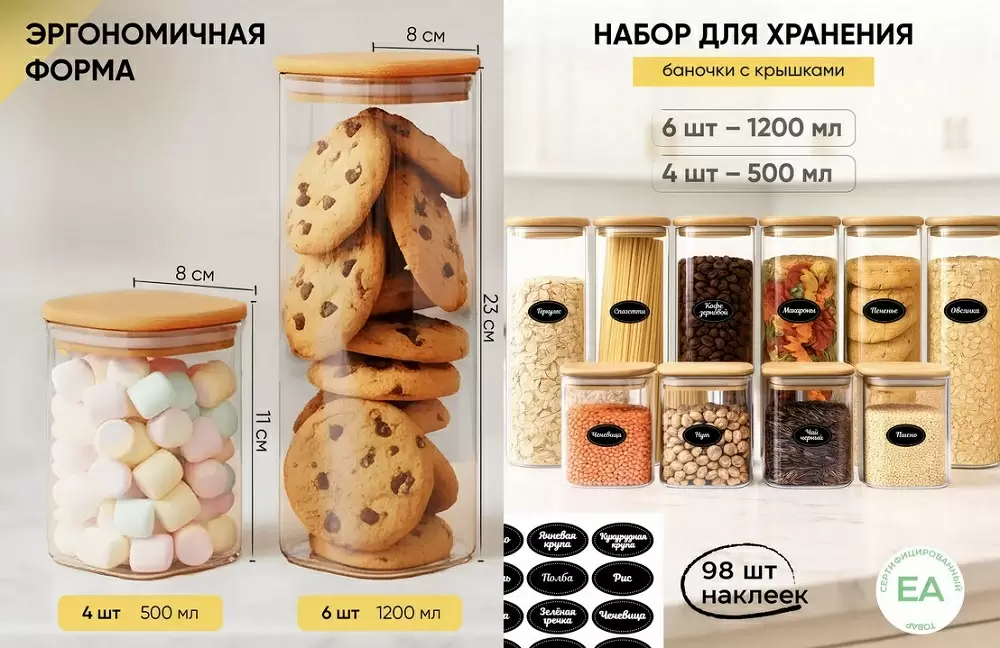 Для тех, кто ценит порядок и стиль, набор стеклянных контейнеров станет настоящим помощником. Он включает не только сами банки, но и набор декоративных наклеек для легкой маркировки.