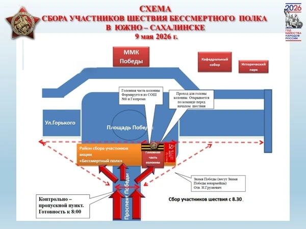 В городе Южно-Сахалинске сбор участников будет осуществляться в западной части площади Победы и прилегающей к ней территории с 8:00 до 10:00 (схема прилагается)