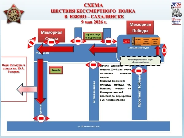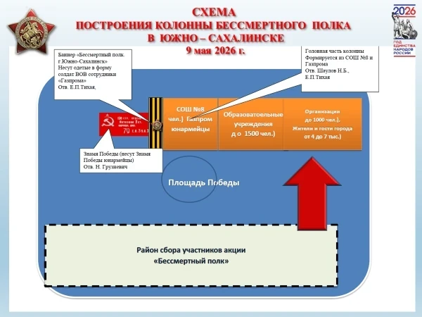 Региональный штаб Общероссийского общественного гражданско-патриотического движения «Бессмертный полк России» приглашает сахалинцев и курильчан принять участие в шествии Бессмертного полка, которое пройдёт в единый день - 9 мая 2026 года, которое состоится во всех административных центрах муниципальных образований Сахалинской области.