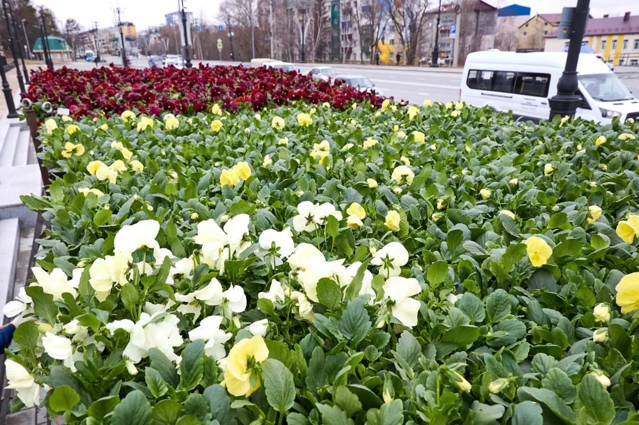 Первые цветы высадили сегодня в Южно-Сахалинске. Традиционно к майским праздникам клумбы украсили на площади Славы. Здесь посадили виолы, которые устойчивы к перепадам температуры.