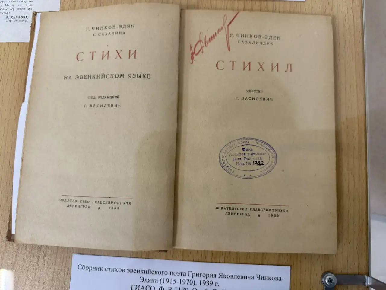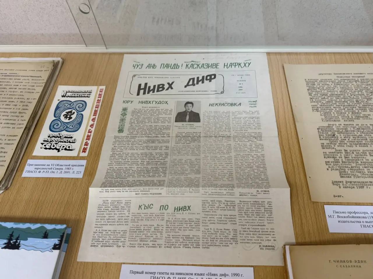 На выставке «Песнь севера» показывают уникальные документы из жизни КМНС. Среди них - единственный архивный экземпляр подлинного сборника стихов эвенкийского поэта Григория Чинкова-Эдяна 1939 года. Среди раритетов также - первый номер газеты «Нифх диф» на нивхском языке, отчеты об оплате за кормление медведя членами рыбколхоза «Свобода», об отпуске скота нивхами Тыми. На стенах выставочного зала - свыше 40 уникальных фотографий быта, традиций, культуры нивхов, ороков, нанайцев и эвенков.